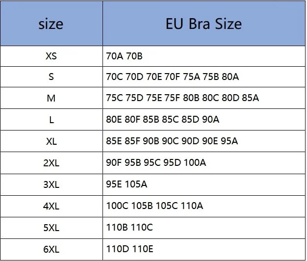 Dydžiai 85E/F, 90B/C, 95D, 100A yra 95-105 cm viršutinei krūtinei, 85 cm po krūtine.